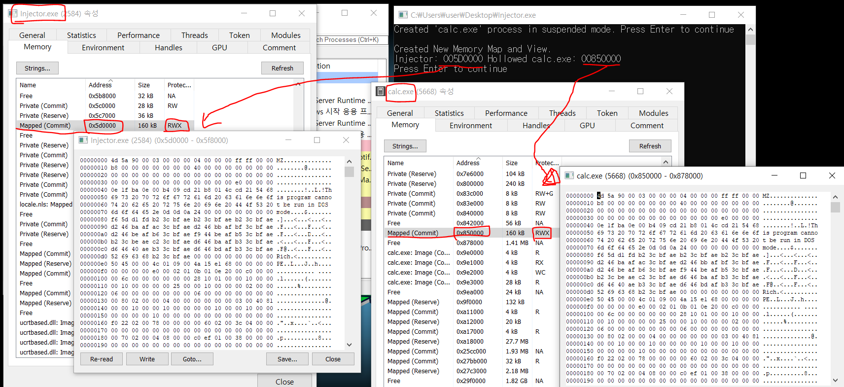 그 다음으로 Injector와 calc.exe에 섹션과 뷰를 생성하여 뷰에 Injector의 메모리 이미지를 넣은 것을 볼 수 있다.