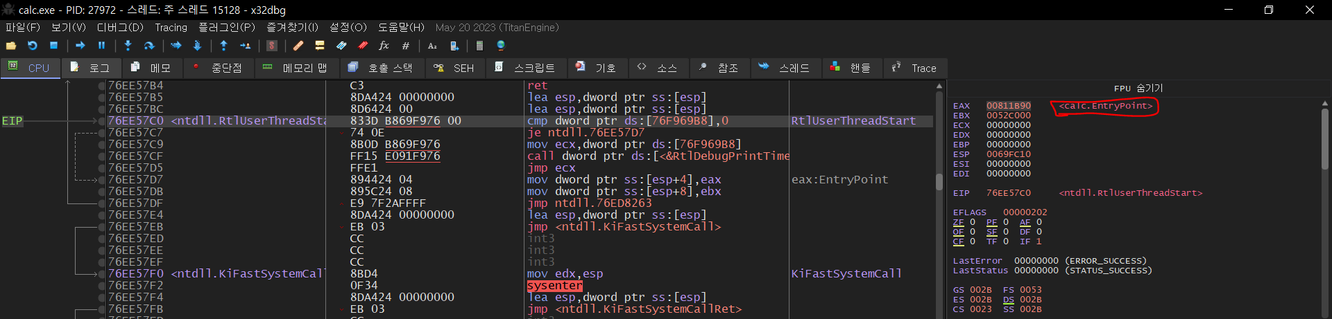 그 이유는 중단된 프로세스의 Eax 레지스터 값에 Entry Point가 들어있기 때문이다.