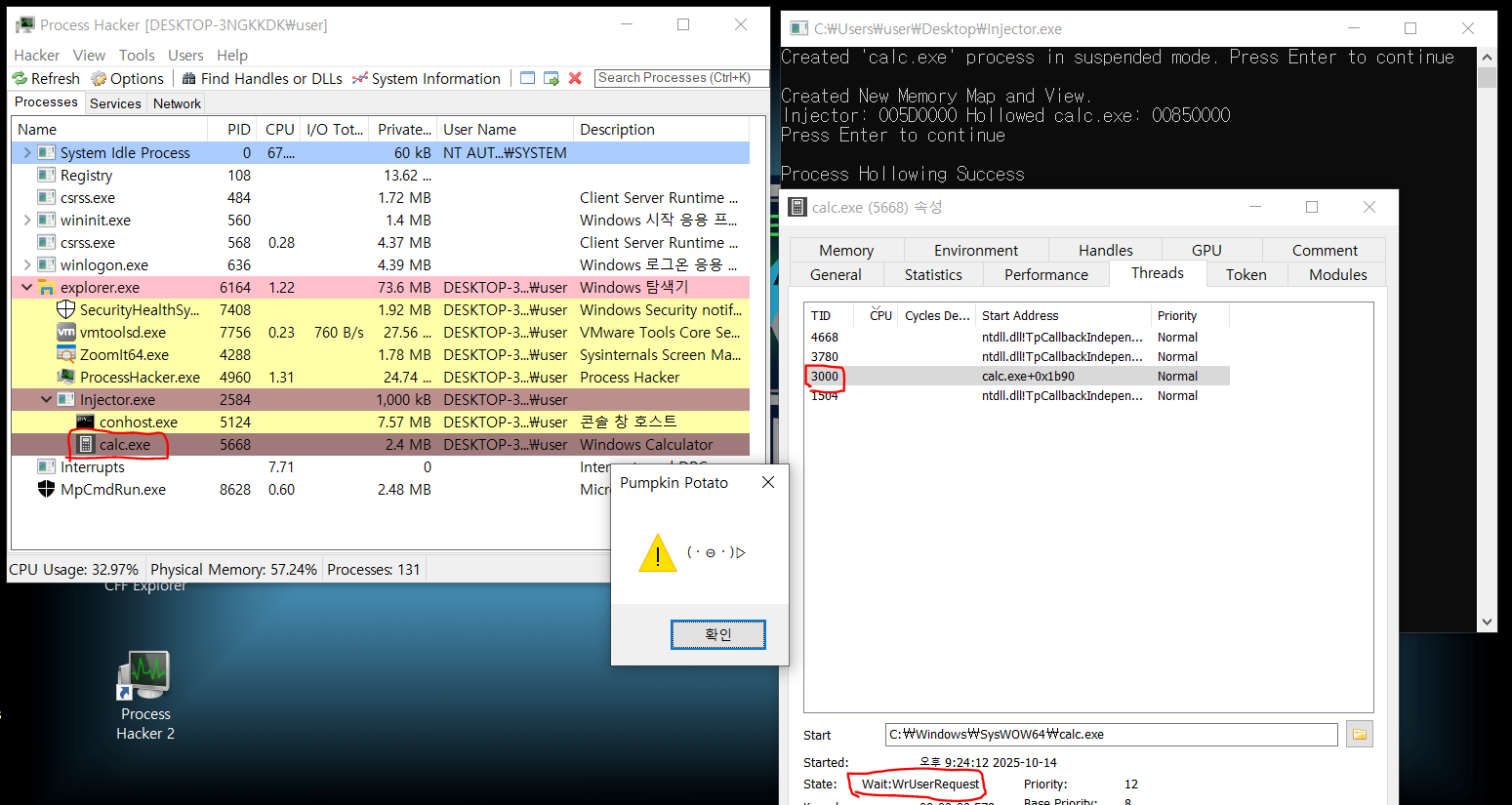 Process Hollowing을 통해 calc.exe를 생성하여 실행했어도 계산기 대신 메세지 창을 띄운다.