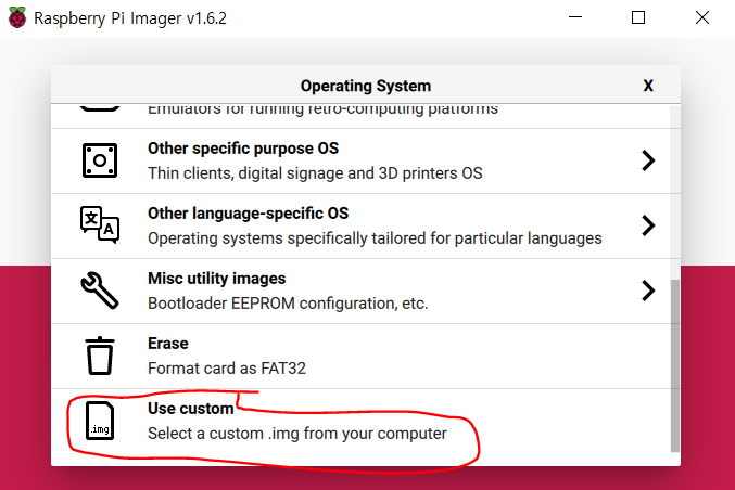 CHOOSE OS 버튼을 누르고 맨 아래 Use custom을 선택해 이미지 파일을 선택해주세요.