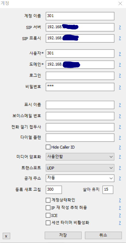 설치 후, SIP 서버 IP 주소, Username, Password를 입력하면 됩니다.